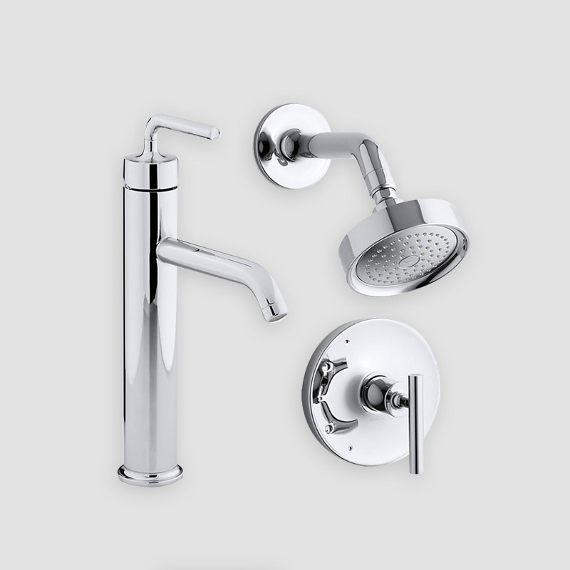 Faucet Package includes both sinks, Roman Tub, and shower fixture. The shower mixing valve handle shall be lever type in a color matching the color selection. NOTE: Towel Bar and TP Holders will be CHROME